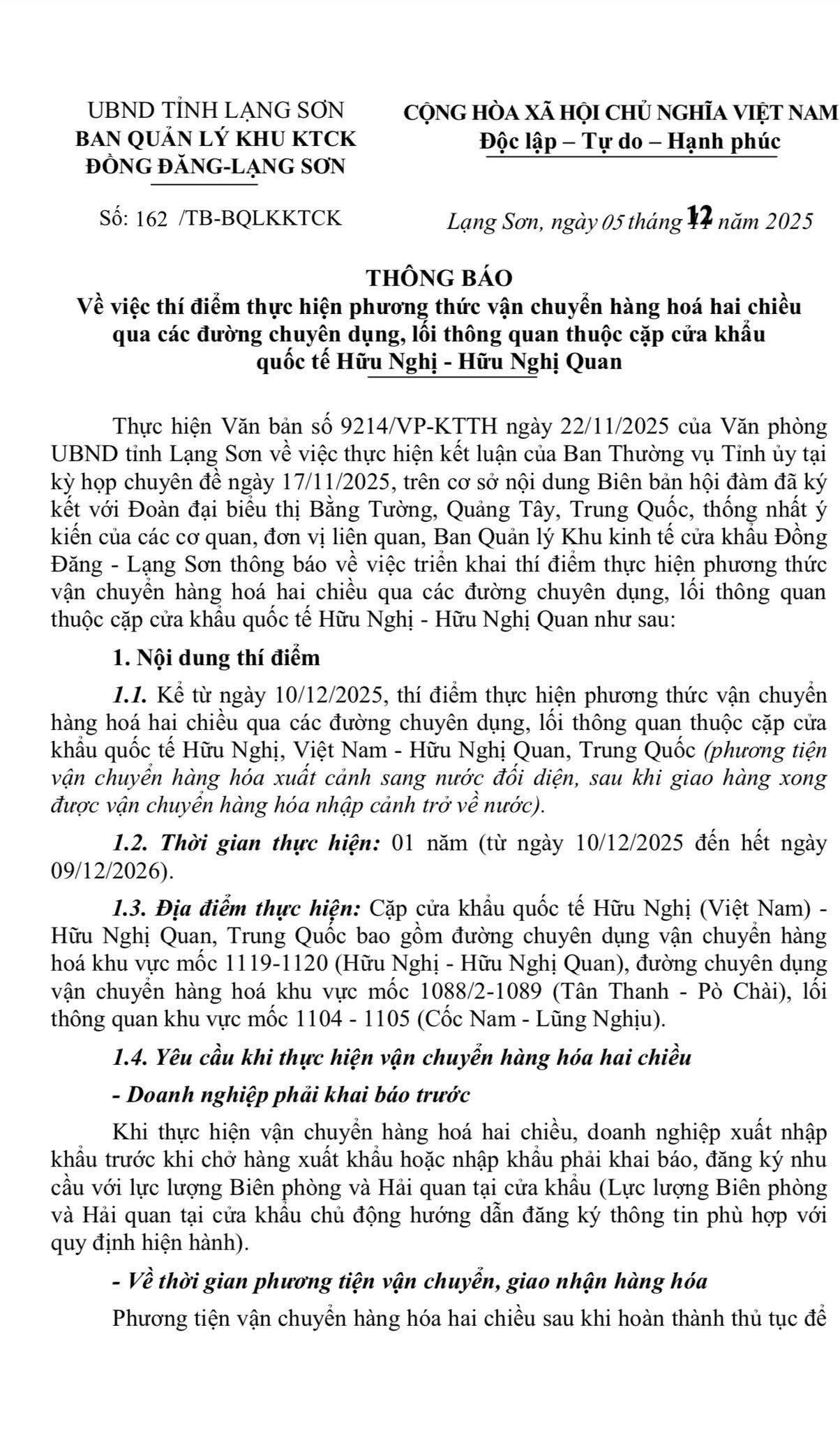 Trong bối cảnh hoạt động xuất nhập khẩu qua biên giới Việt Nam – Trung Quốc thường xuyên chịu áp lực ùn ứ, chi phí logistics cao và hiệu suất quay vòng phương tiện thấp, Ban Quản lý Khu kinh tế cửa khẩu Đồng Đăng – Lạng Sơn đã ban hành Thông báo số 162/TB-BQLKKTCK về việc thí điểm phương thức vận chuyển hàng hóa hai chiều qua các đường chuyên dụng, lối thông quan thuộc cặp cửa khẩu quốc tế Hữu Nghị (Việt Nam) – Hữu Nghị Quan (Trung Quốc).