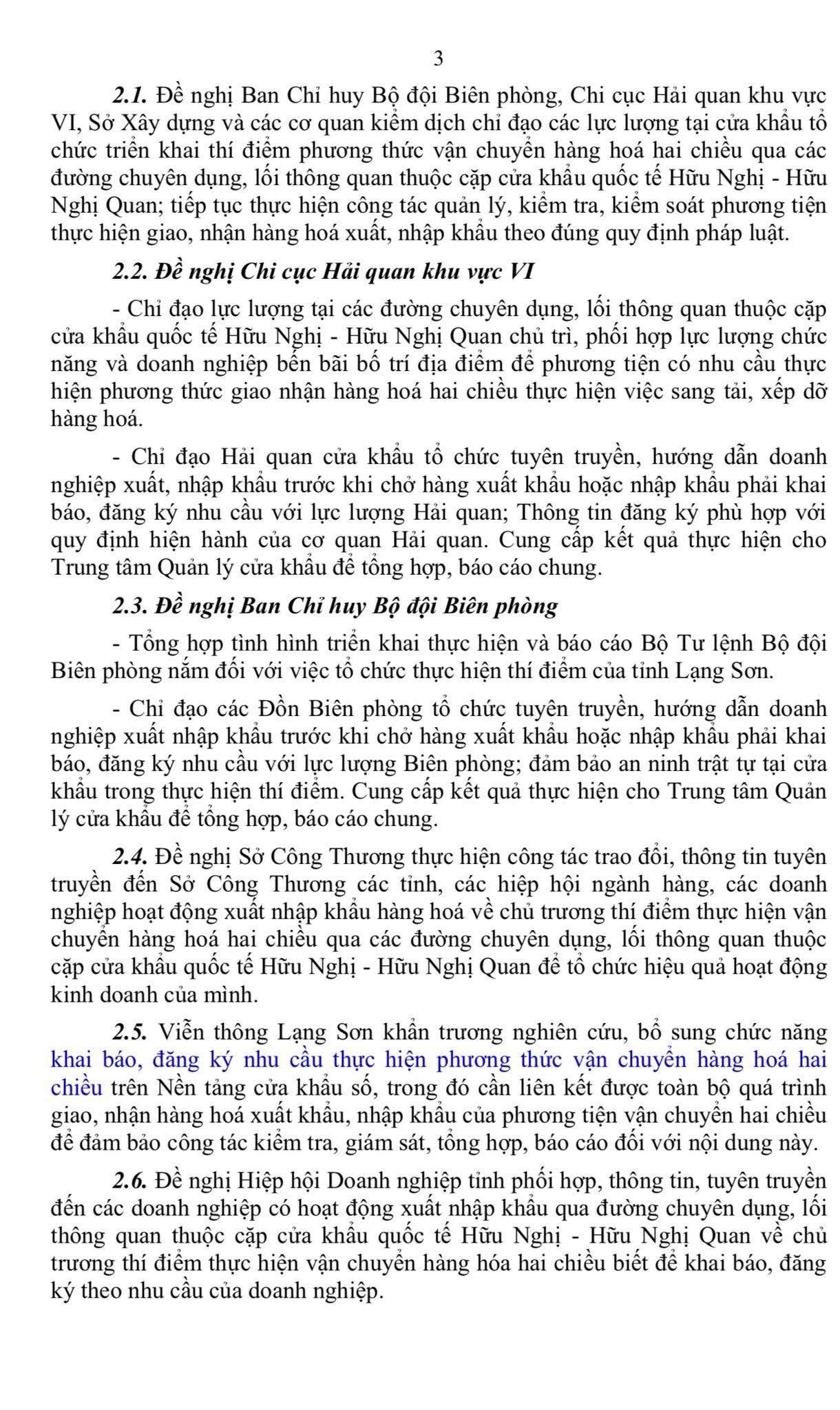 Theo thông báo, từ ngày 10/12/2025 đến hết ngày 09/12/2026, Lạng Sơn sẽ thí điểm trong thời gian 01 năm phương thức vận chuyển hàng hóa hai chiều. Theo đó, phương tiện vận chuyển hàng xuất khẩu của Việt Nam sau khi giao hàng tại phía Trung Quốc được phép nhận hàng nhập khẩu và quay trở lại Việt Nam, thay vì phải quay về rỗng như trước đây.