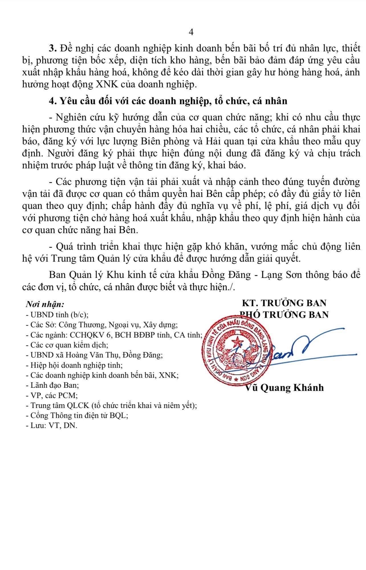 Phạm vi áp dụng bao gồm cặp cửa khẩu quốc tế Hữu Nghị – Hữu Nghị Quan, cùng các tuyến đường chuyên dụng và lối thông quan tại các khu vực mốc 1119–1120, 1088/2–1089 (Tân Thanh – Pò Chài) và 1104–1105 (Cốc Nam – Lũng Nghịu).